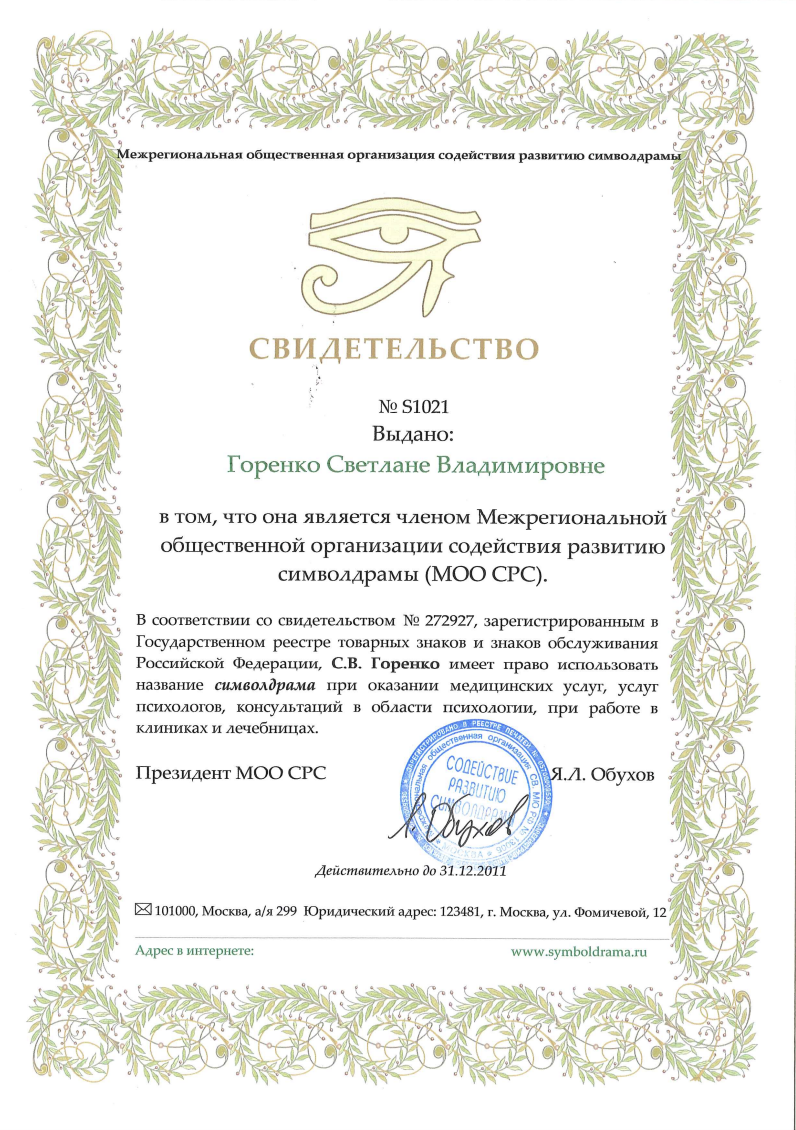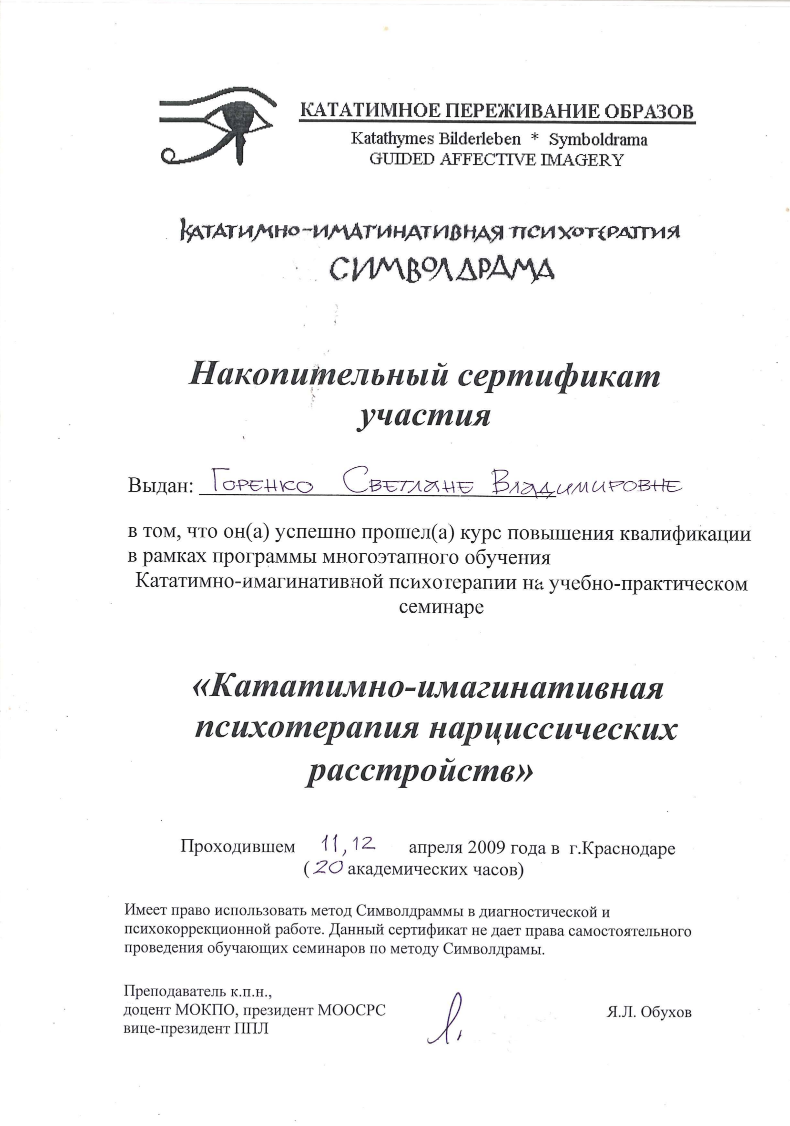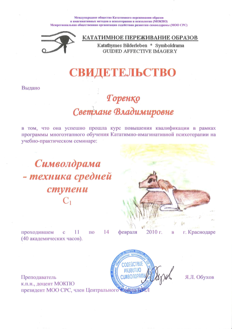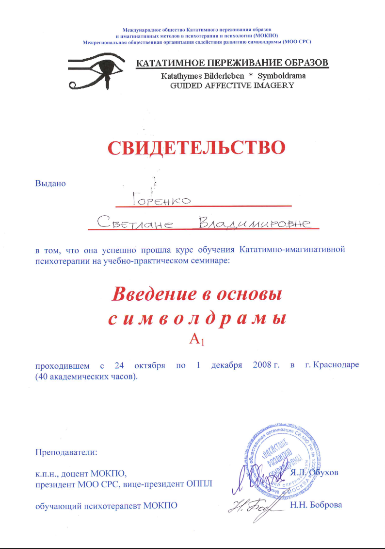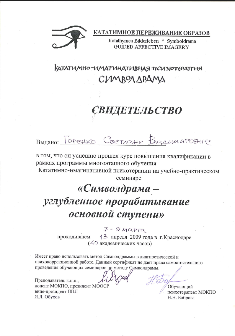 - Символдрама: Углублённое изучение основной ступени (40 часов, Краснодар, 2009)
