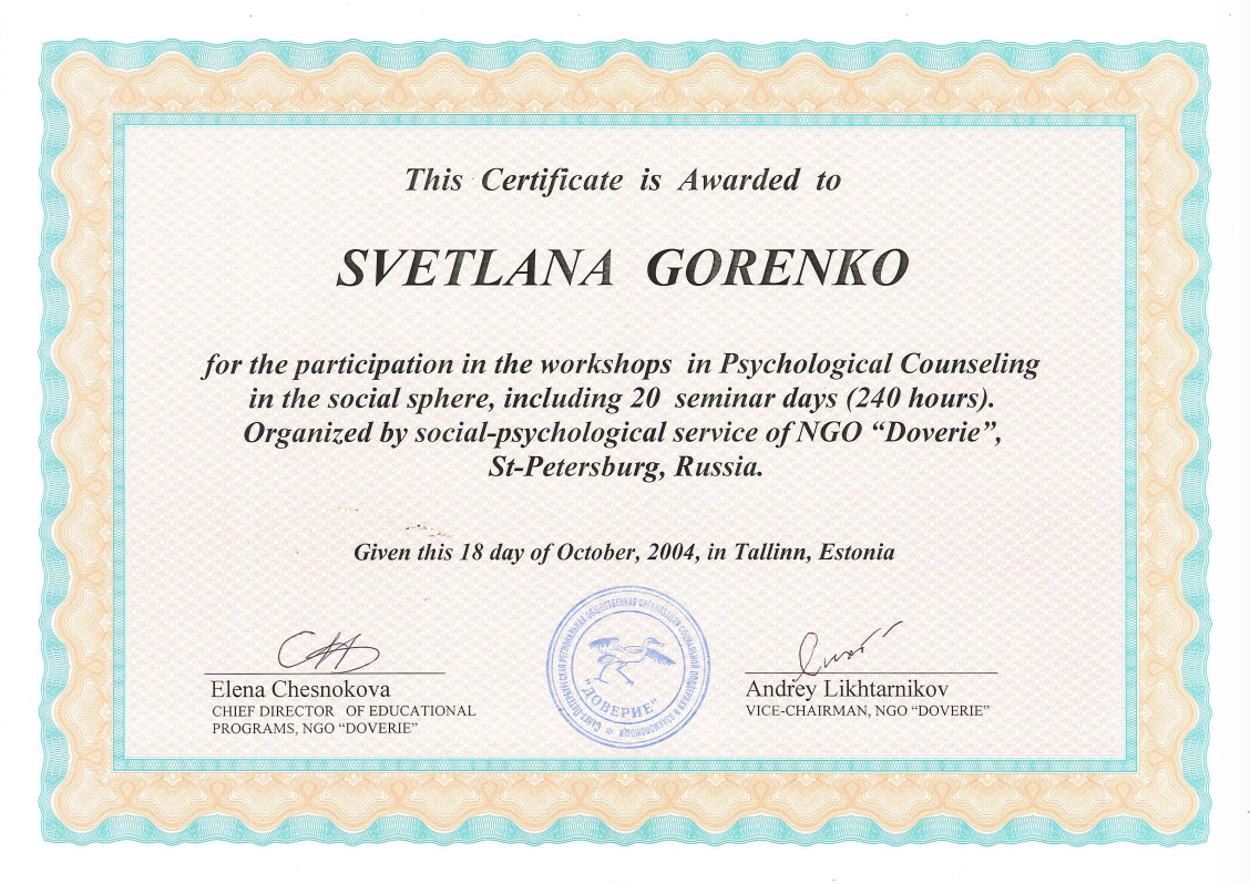 - Римас Кочунос: Терапевтический процесс экзистенциального сопровождения клиента (30 часов, Таллин, 2004)